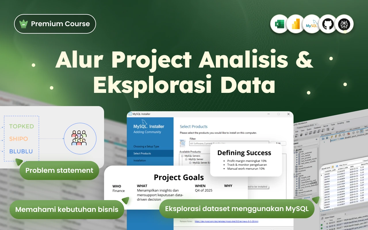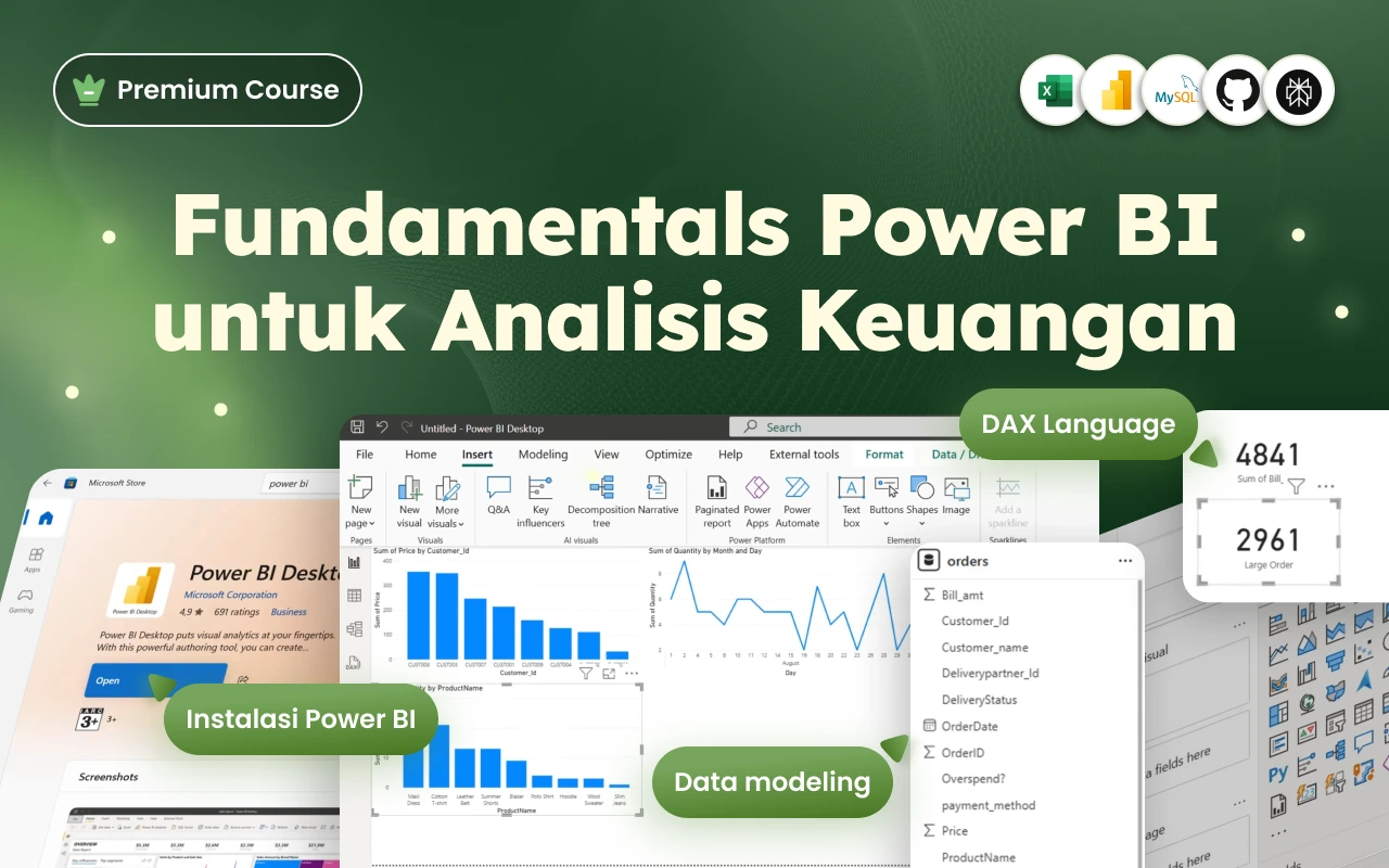 Kita akan mulai dari eksplorasi data menggunakan MySQL, di mana kamu akan berlatih menulis query untuk menemukan insight dari data mentah. Setelah itu, kamu akan membawa data tersebut ke Power BI dan belajar membangun dashboard keuangan secara lengkap—selangkah demi selangkah, seperti seorang data analyst profesional.