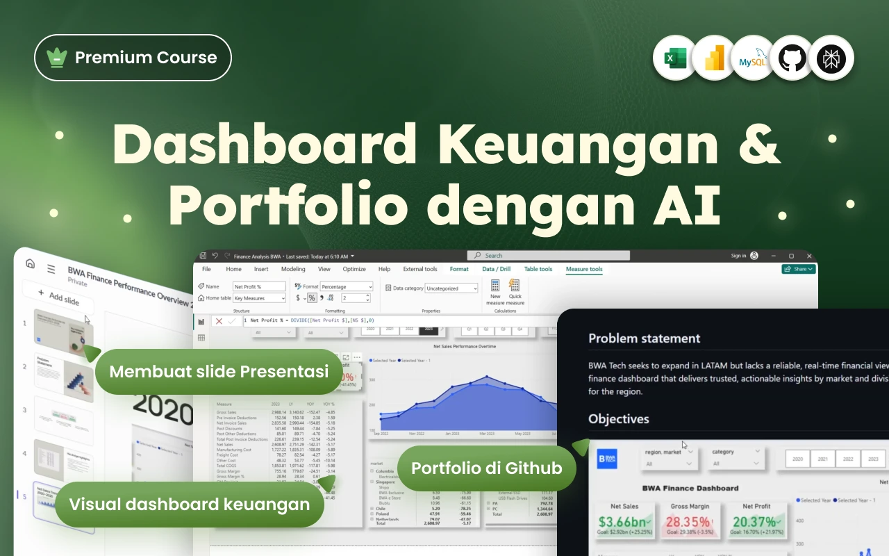 Kamu juga akan menguasai dasar-dasar DAX (Data Analysis Expressions) dengan membuat calculated column, measure, serta menerapkan filter untuk menjawab pertanyaan bisnis. Di akhir kelas, kamu bukan hanya memahami logika analisis keuangan, tapi juga mampu mengkomunikasikan insight melalui dashboard yang rapi, interaktif, dan terlihat profesional dengan optimisasi AI Tools Perplexity.