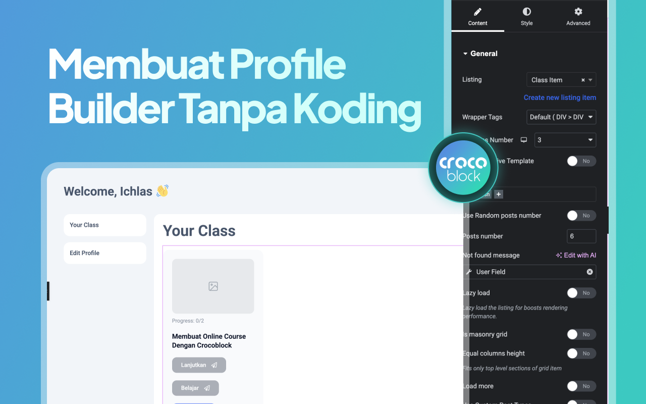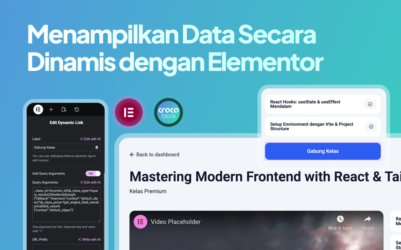 Di akhir kelas, kamu tidak hanya memiliki contoh platform online course yang solid, tetapi juga skill teknis untuk membangun berbagai jenis website dinamis berbasis Elementor dan Crocoblock. Kelas ini cocok bagi kamu yang ingin serius memahami sistem edukasi digital dan menjadikannya sebagai portfolio tingkat lanjut, pondasi bisnis, atau layanan profesional—bukan sekadar membuat halaman promosi.