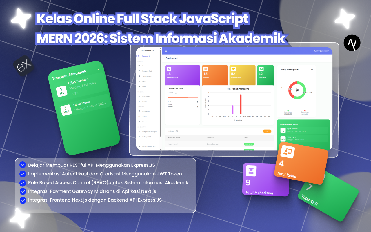 Pada kelas ini, peserta akan mempelajari pengembangan backend menggunakan Express.js untuk membangun RESTful API, implementasi autentikasi dan otorisasi menggunakan JWT, serta Role Based Access Control (RBAC) untuk Admin, Dosen, dan Mahasiswa. Aplikasi juga terintegrasi dengan Payment Gateway Midtrans untuk mendukung proses pembayaran yang aman dan terstruktur.