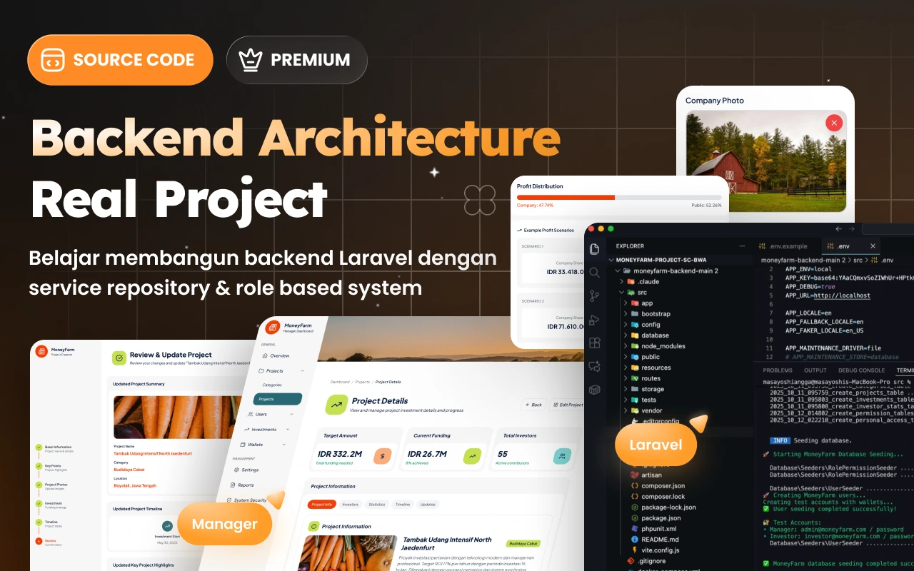 Backend menggunakan Laravel 12 dengan pendekatan API-first, Sanctum untuk authentication session-based, dan role-based access (Manager & Investor) untuk memisahkan fitur admin dan pengguna. Seluruh endpoint dirancang RESTful dengan pola service–repository agar setiap domain (project, farmer, category, wallet, investment) memiliki logic bisnis yang terstruktur, mudah di-test, dan sangat mudah di-scale ketika traffic atau pengguna meningkat.