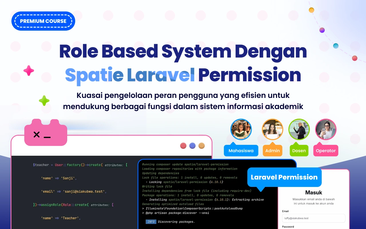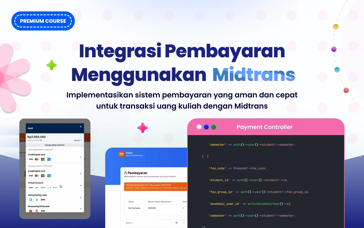 Kelas ini juga mencakup implementasi pembayaran menggunakan Midtrans yang memungkinkan transaksi uang kuliah dilakukan dengan cepat dan aman. Dengan materi yang terstruktur dan studi kasus yang realistis, Anda akan memperoleh keterampilan yang dapat langsung diterapkan untuk membangun sistem informasi akademik di dunia nyata.