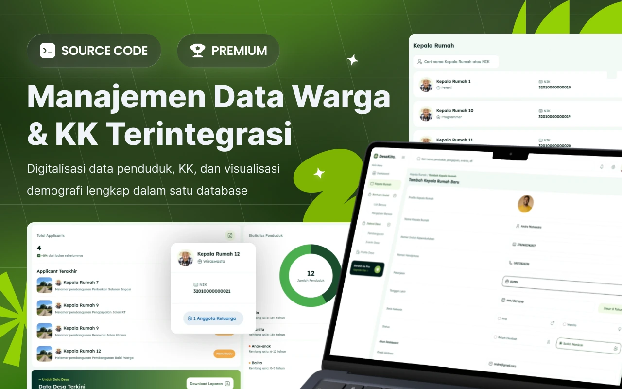 Desa Kita (Desa Digital) adalah source code dashboard siap pakai untuk membantu pemerintah desa mengelola operasional data dan layanan publik dalam satu sistem terpusat. Mulai dari pendataan warga dan kartu keluarga, pengelolaan program bantuan sosial, agenda dan event desa, sampai monitoring proyek pembangunan, semuanya dirancang dalam alur kerja yang rapi dan mudah dipakai.