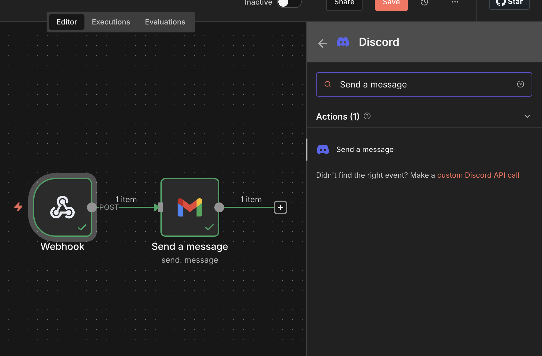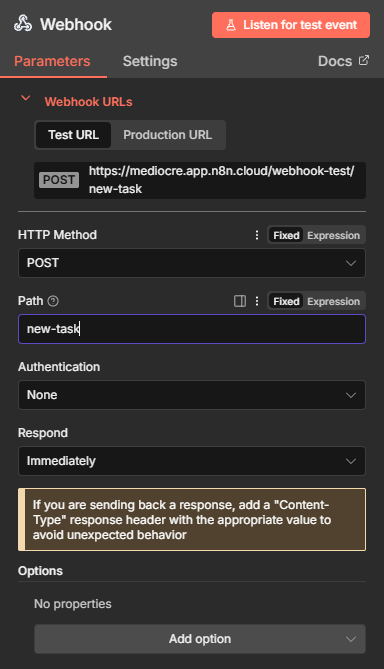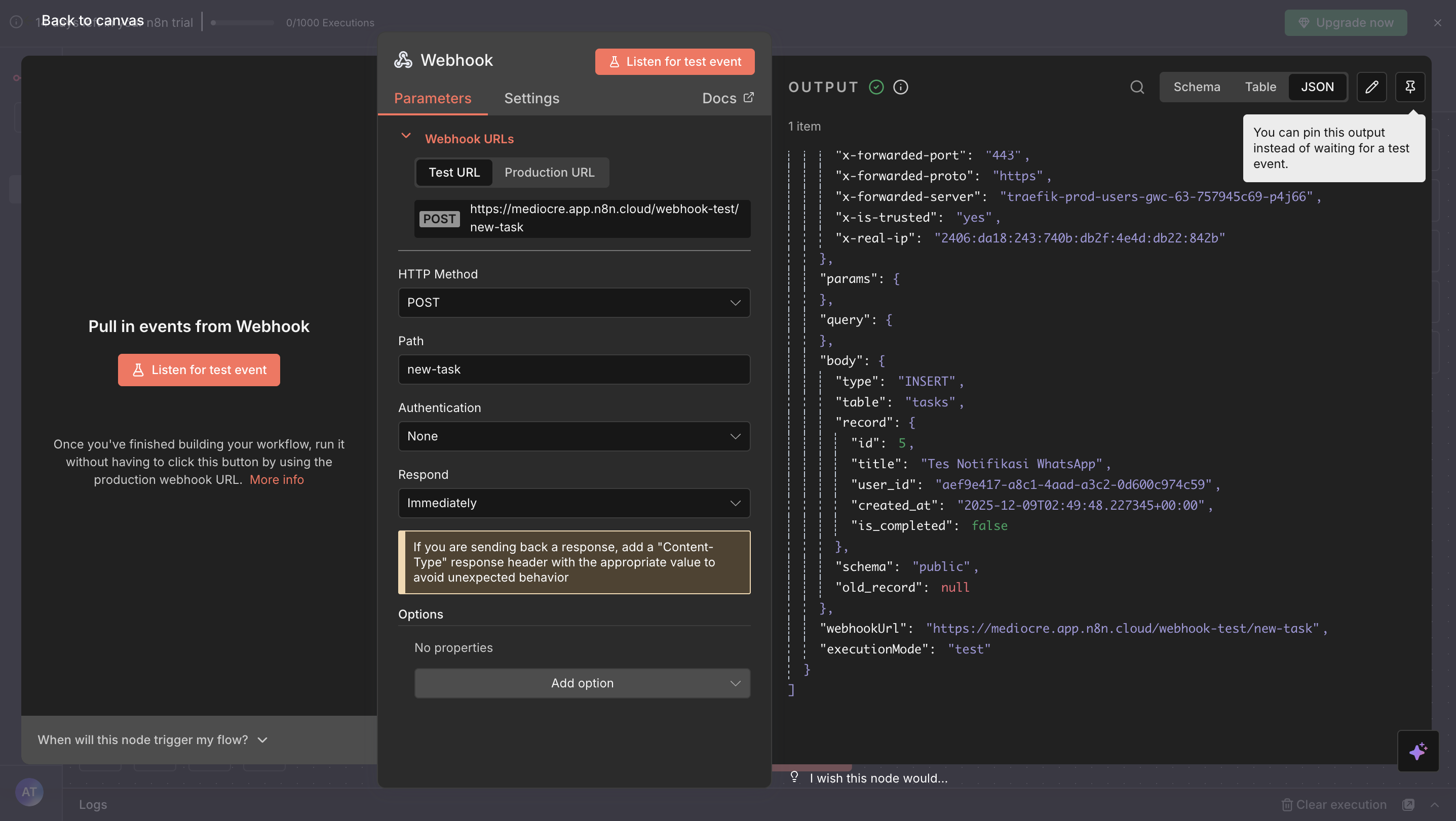 - Jika tes berhasil, kembali ke node Webhook di n8n.