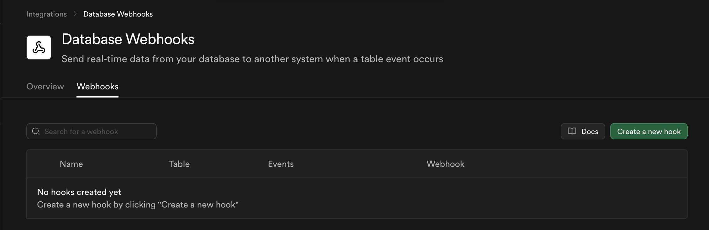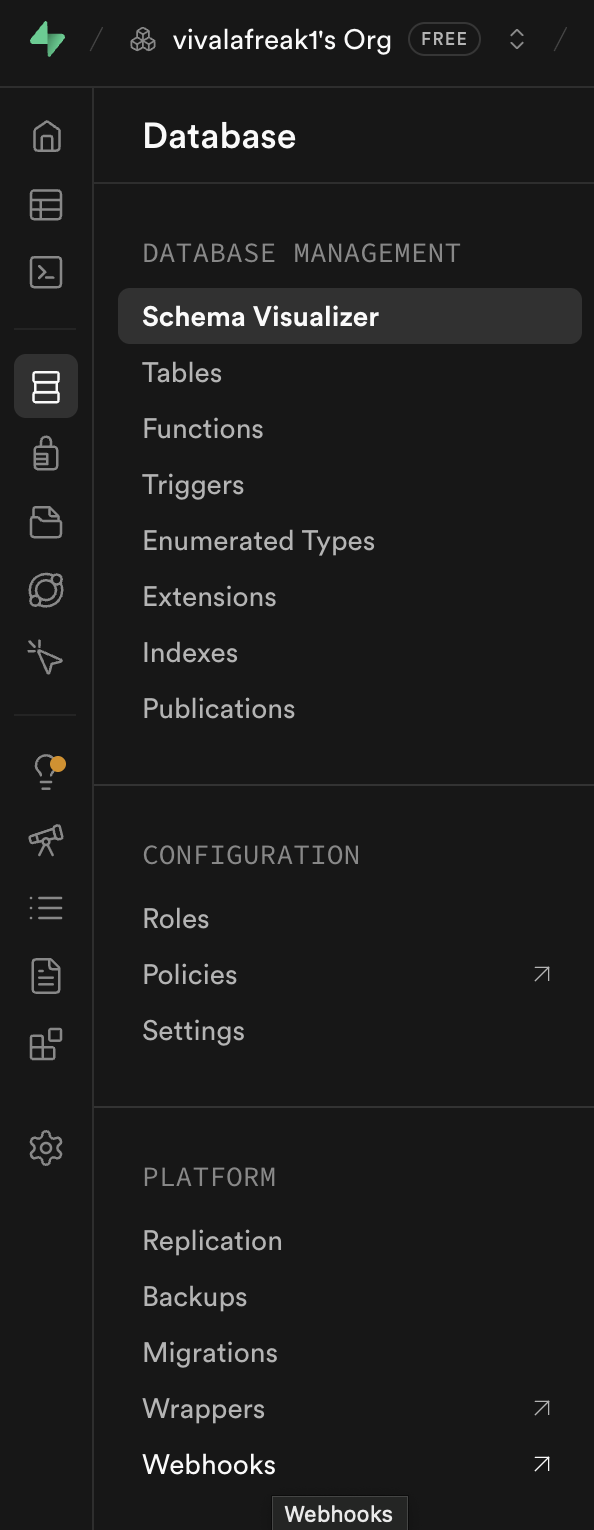 - Klik menu Database (ikon silinder bertumpuk) -> Webhooks.