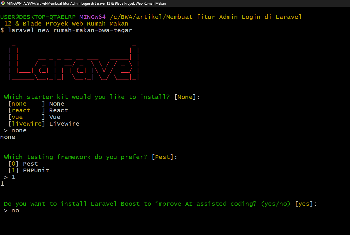 Perintah “laravel new rumah-makan-bwa-tegar” digunakan untuk membuat sebuah proyek Laravel baru dengan nama tersebut sehingga kita memiliki struktur aplikasi yang siap dipakai untuk melanjutkan proses pembuatan fitur Laravel Login.