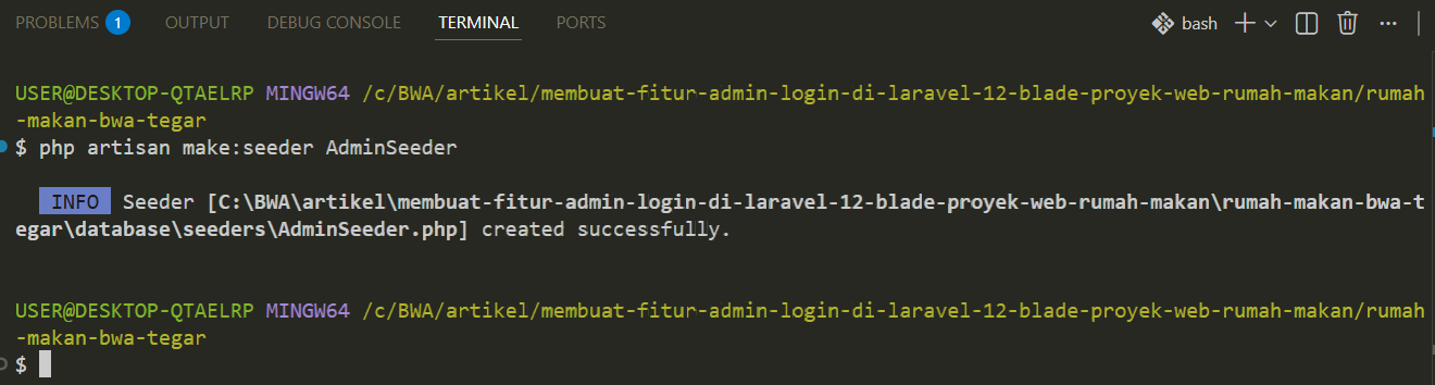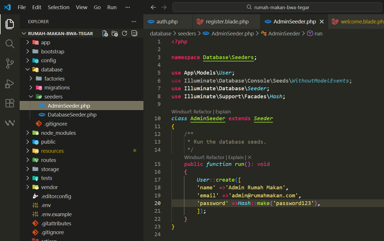 Karena fitur registrasi telah kita nonaktifkan demi keamanan, kita memerlukan cara alternatif untuk memasukkan data administrator pertama kali ke dalam sistem melalui Database Seeder.
