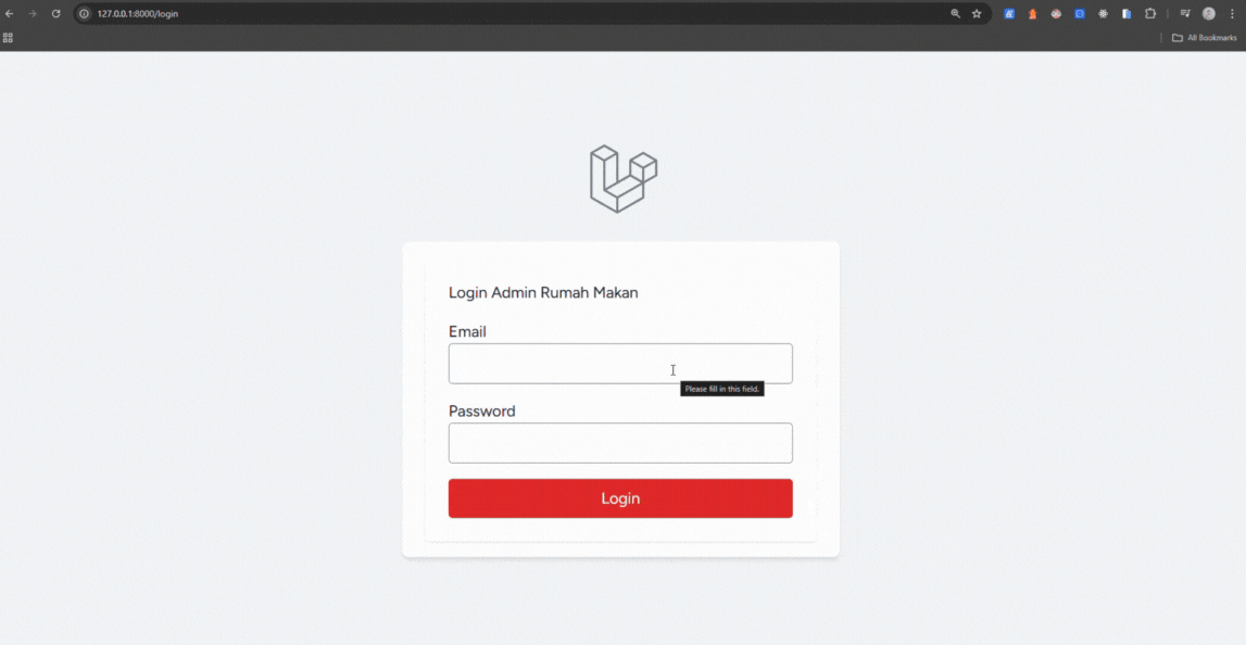 Pada tahap ini, kita akan mensimulasikan proses masuknya seorang admin ke dalam sistem, mulai dari pengisian formulir hingga memastikan bahwa rute keamanan bekerja dengan sempurna dan mengantarkan kita ke halaman utama manajemen rumah makan.