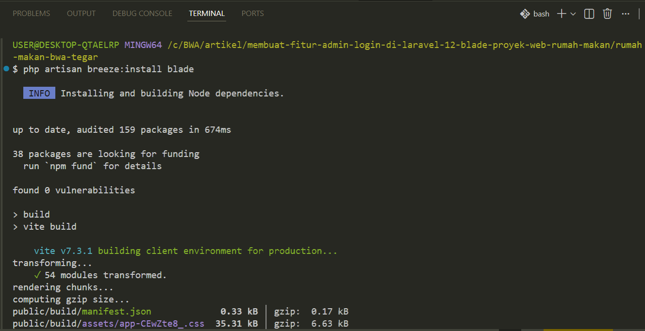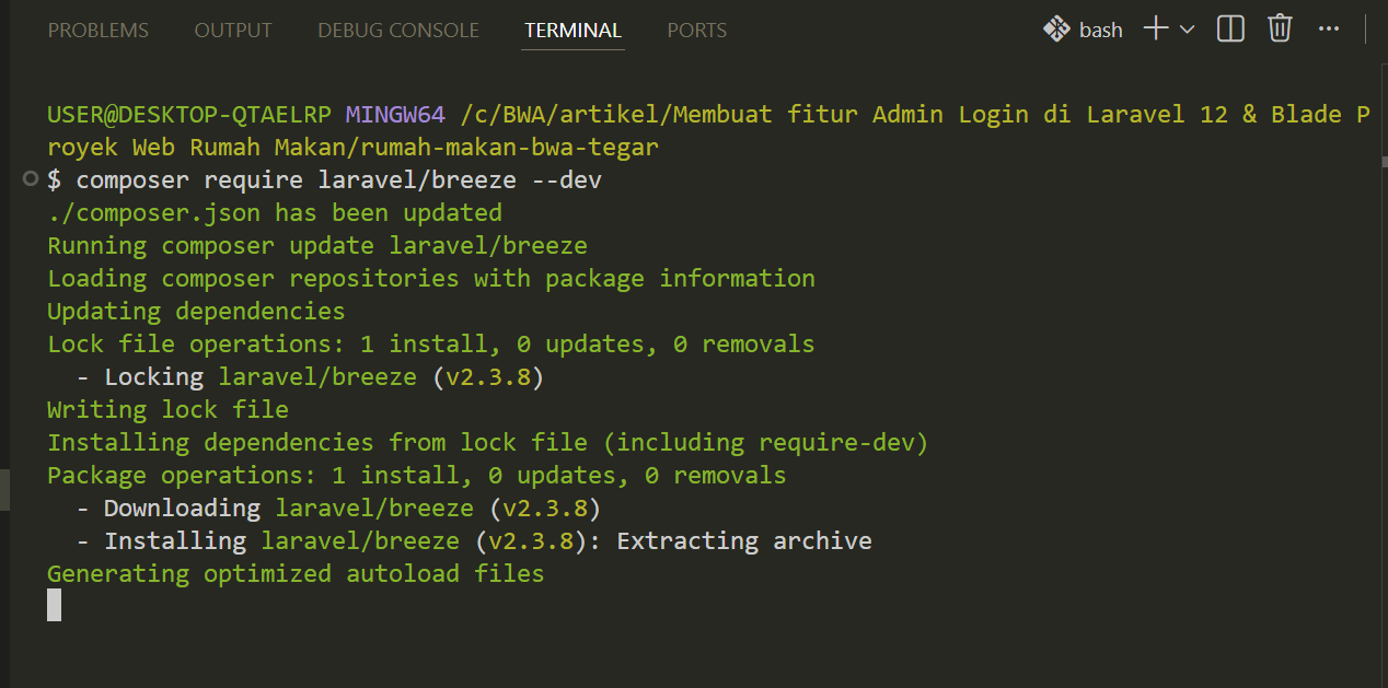 Selanjutnya kita jalankan perintah Laravel Breeze (Blade). Seperti ini di terminal kalian.