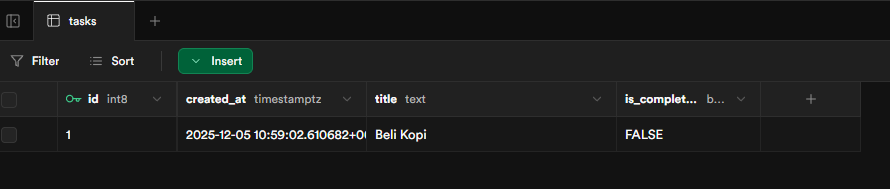- Cek di dashboard Supabase Anda (Table Editor), lalu klik refresh tabelnya. Apakah tulisan "Beli Kopi" muncul di sana?