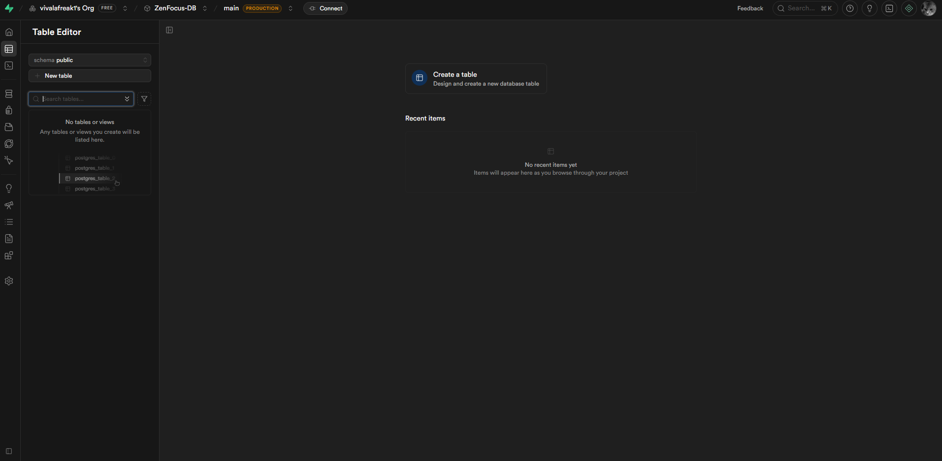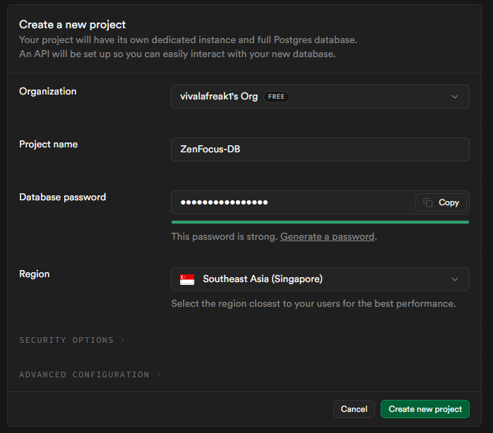 ZenFocus-DB), buat password database yang kuat, pilih region (Singapore/Jakarta agar cepat), lalu klik Create New Project. - Tunggu sekitar 1-2 menit hingga database siap.