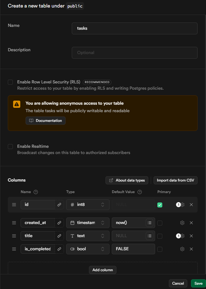 tasks - Enable RLS: Hapus centang ini dulu (Uncheck). (Catatan: Untuk keamanan level produksi, RLS harus aktif. Tapi untuk belajar agar tidak error "Permission Denied" yang bikin pusing, kita matikan dulu).
