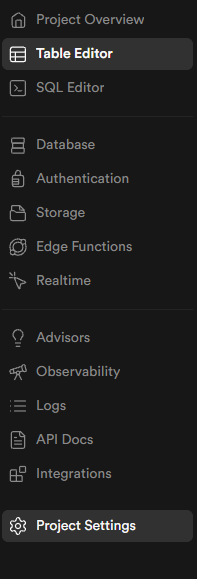 - Di menu kiri dashboard Supabase, klik ikon Table Editor (seperti gambar tabel).