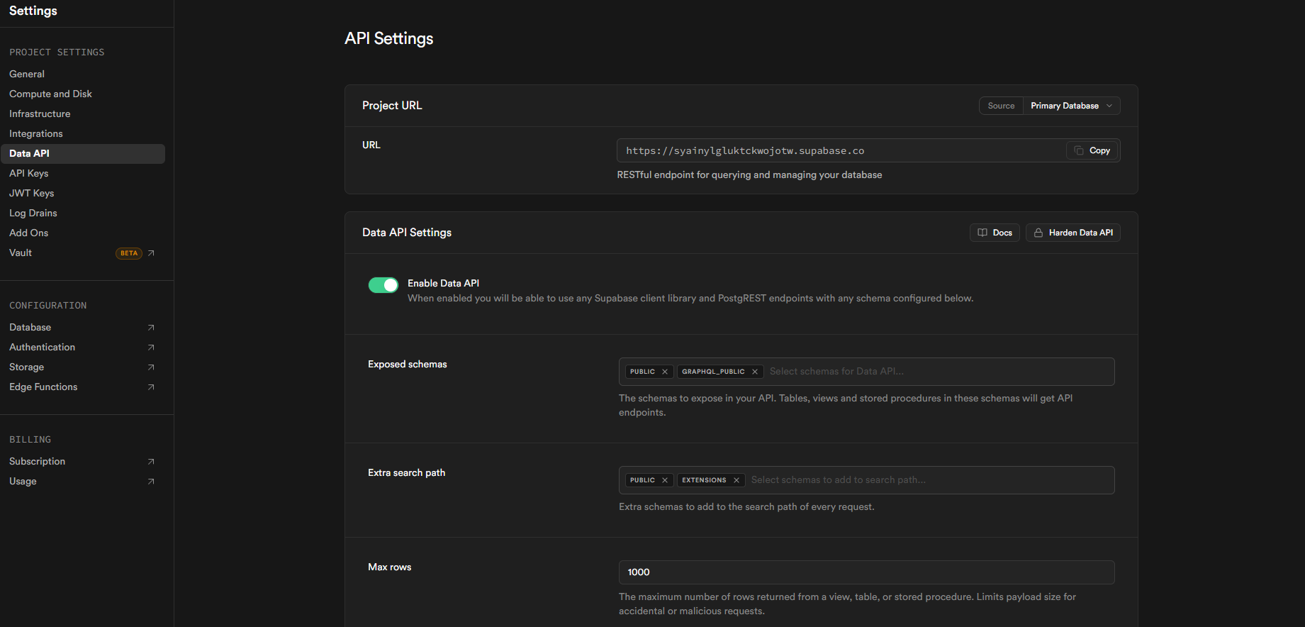 - Di dashboard Supabase, klik ikon Settings (gerigi di bawah kiri).