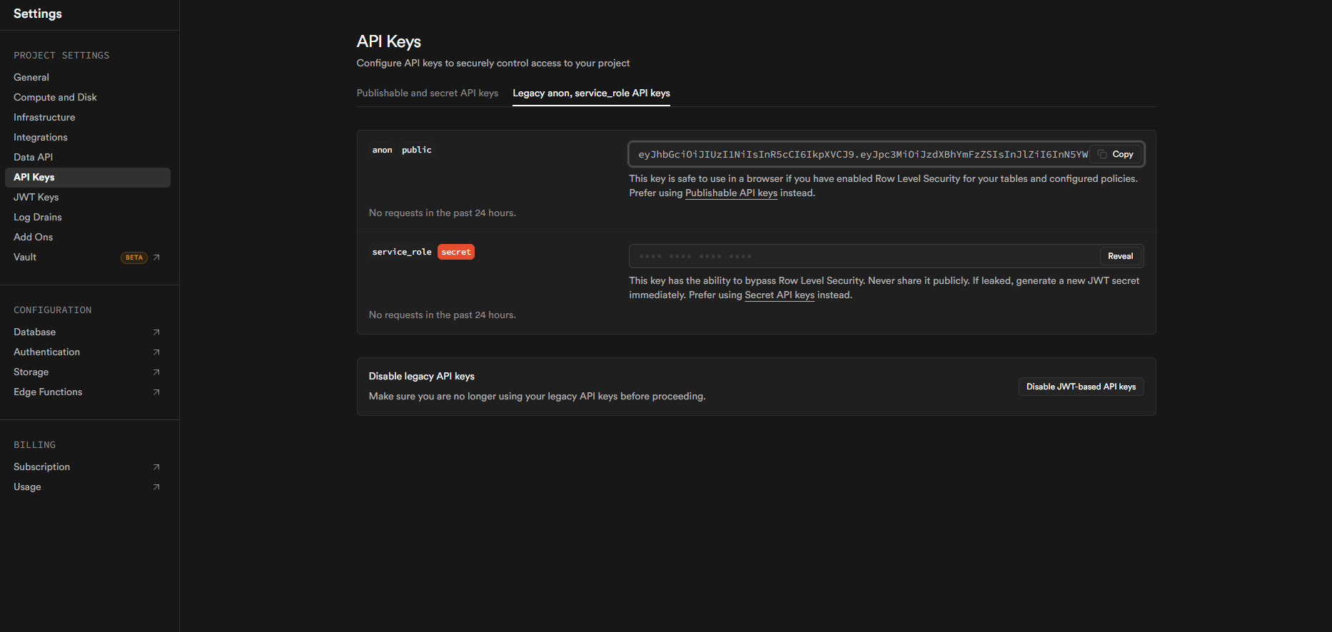 - Pilih API Keys, lalu pergi ke Anon untuk melihat key