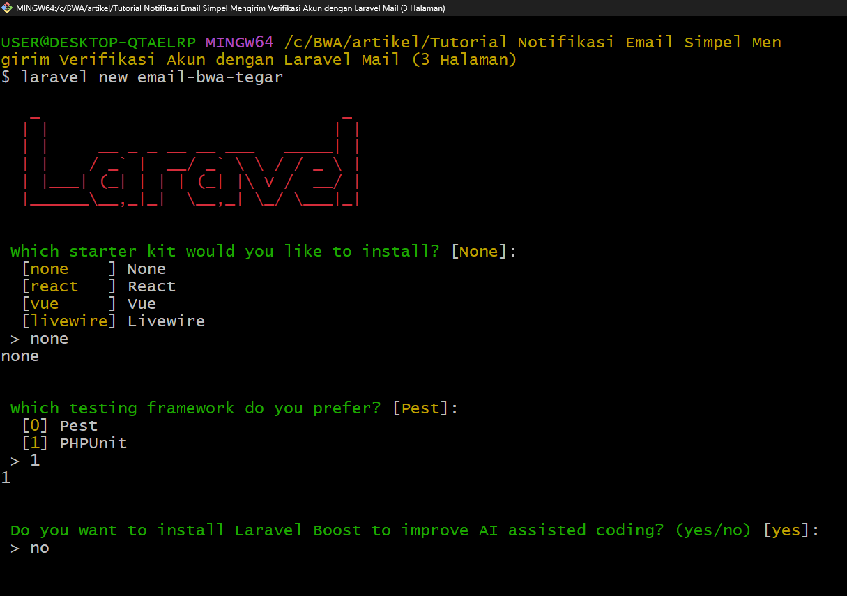 Perintah “laravel new email-bwa-tegar” digunakan untuk membuat sebuah proyek Laravel baru dengan nama tersebut sehingga kita memiliki struktur aplikasi yang siap dipakai untuk melanjutkan proses pembuatan fitur Laravel Email.