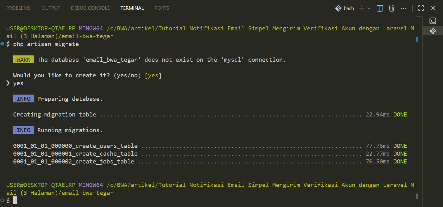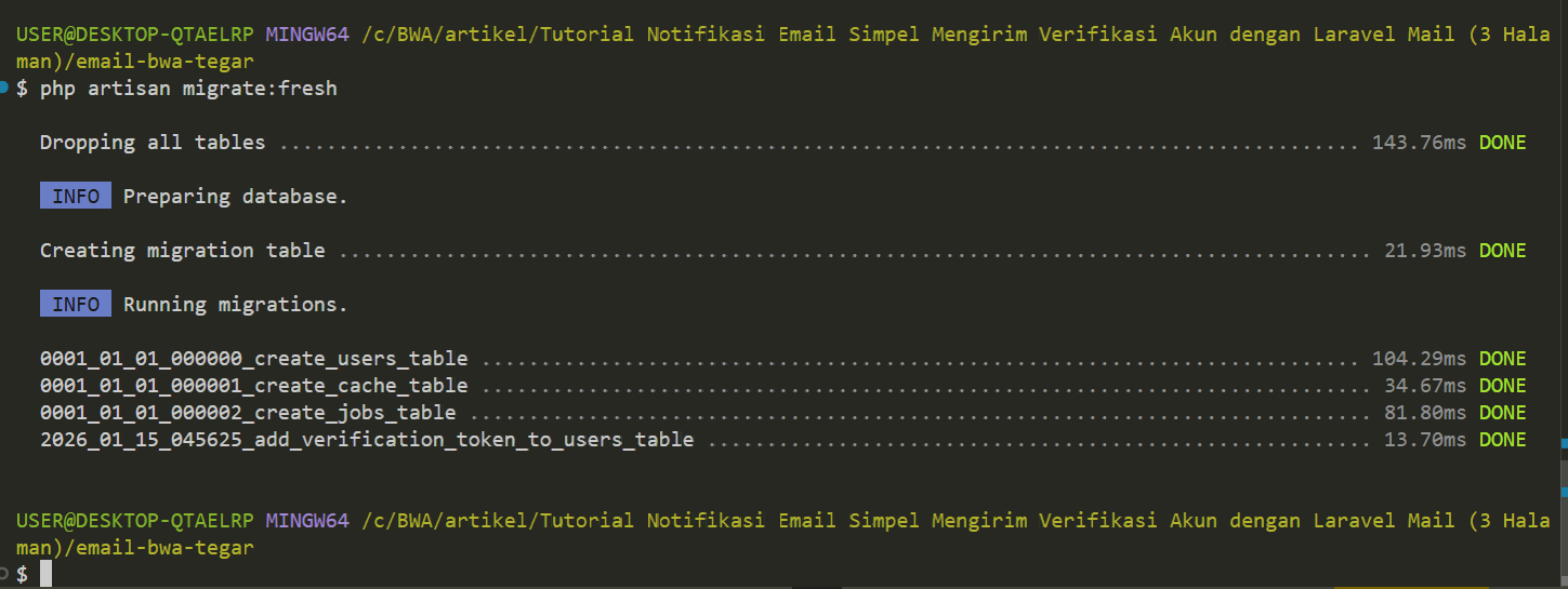 Perintah “php artisan migrate” dijalankan untuk membuat seluruh tabel yang sudah didefinisikan dalam file migration agar database siap digunakan dalam proyek Laravel Email ini.