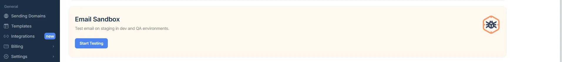 Klik tombol “Start Testing” yang berada di bagian “Email Sandbox” seperti contoh gambar di atas yang ada gambar bug.