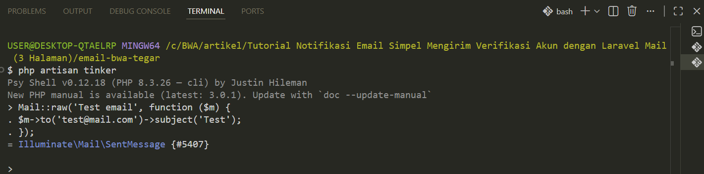 Perintah “composer create-project laravel/laravel email-bwa-tegar” digunakan untuk membuat proyek Laravel baru menggunakan Composer, sehingga seluruh file dan dependensi Laravel terunduh otomatis dan siap digunakan sebagai dasar pengembangan fitur Laravel Email.
