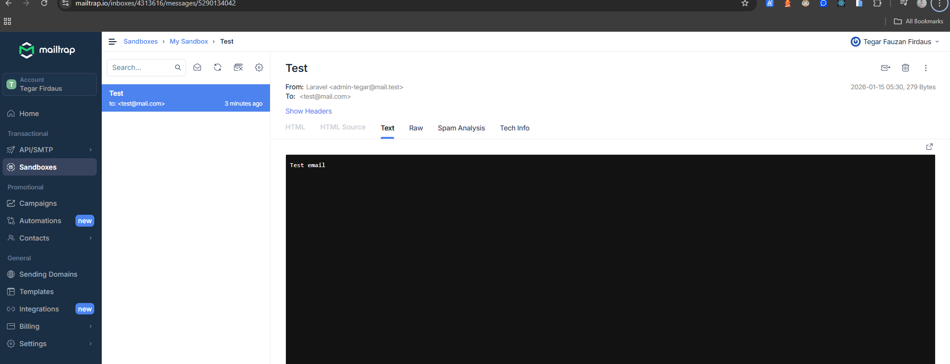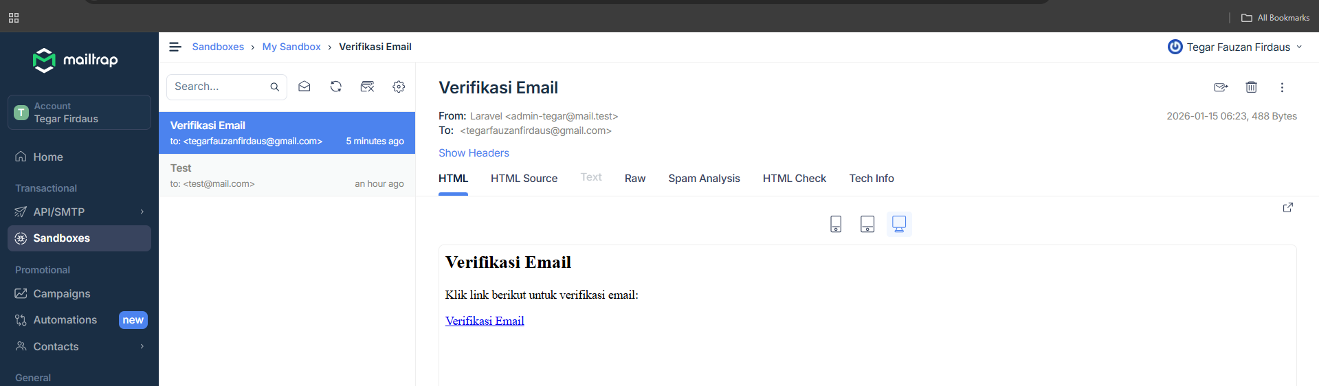 Lalu kalau di mailtrap kalian muncul gini artinya berhasil