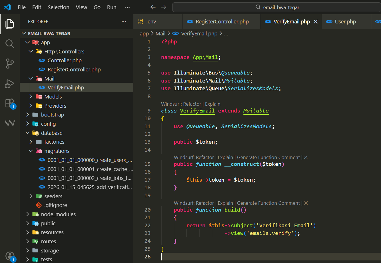Isi VerifyEmail.php dengan cara buka file tersebut, lalu hapus isinya semua dan isi seperti ini (versi sederhana):