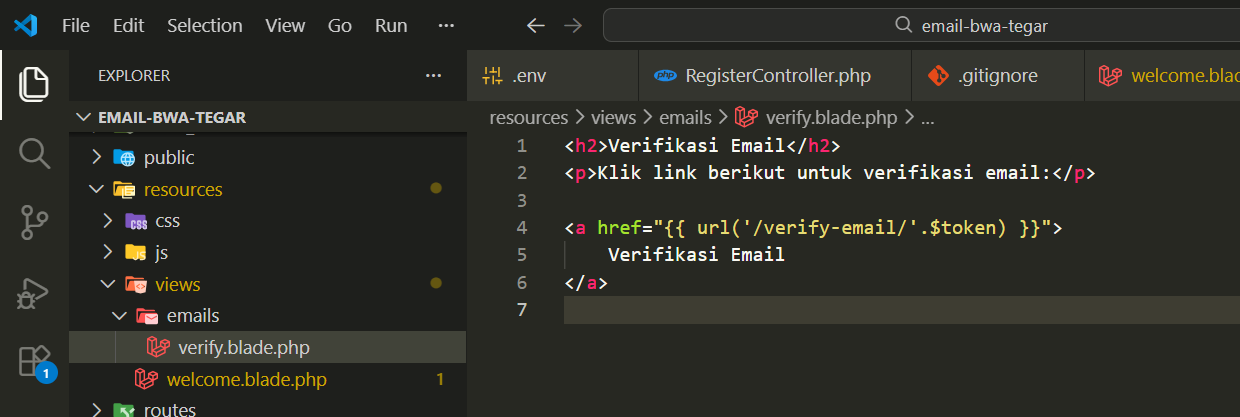 Buat file baru bernama verify.blade.php di dalam folder resources/views/emails/ dan isi sebagai berikut: