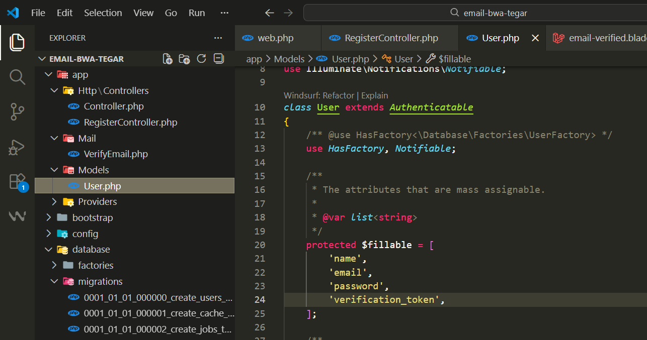 Buka filenya lalu tambahkan verification_token ke $fillable seperti ini