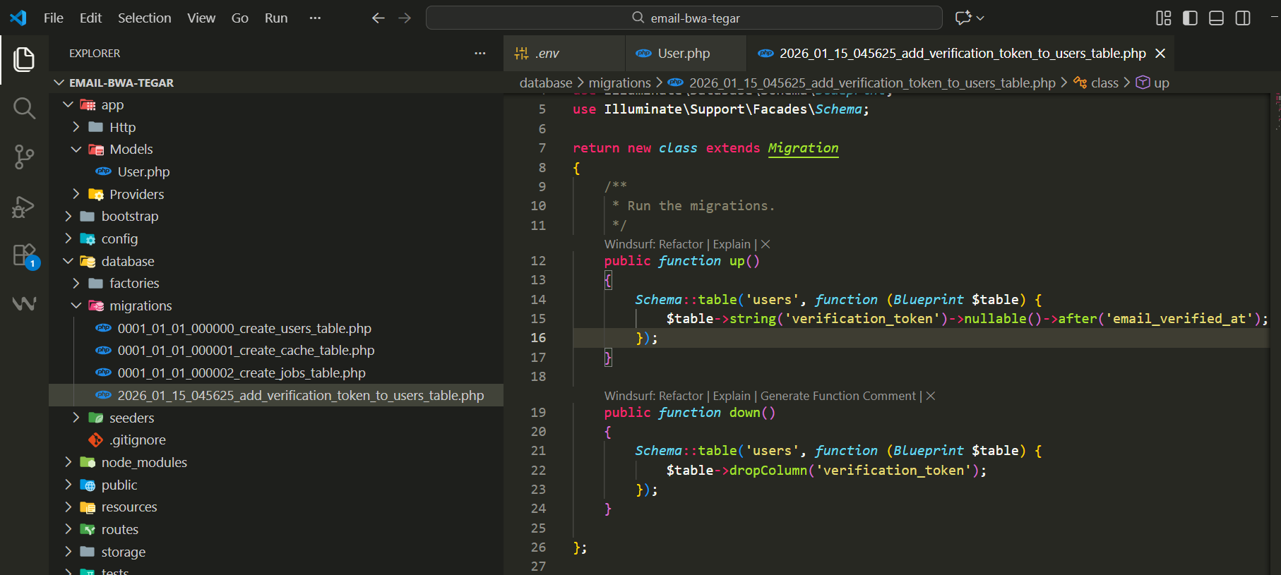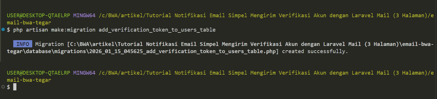 Lalu masuk ke file 2026_01_15_045625_add_verification_token_to_users_table.php sesuai gambar hasil di atas dan isi migrationnya sebagai berikut: