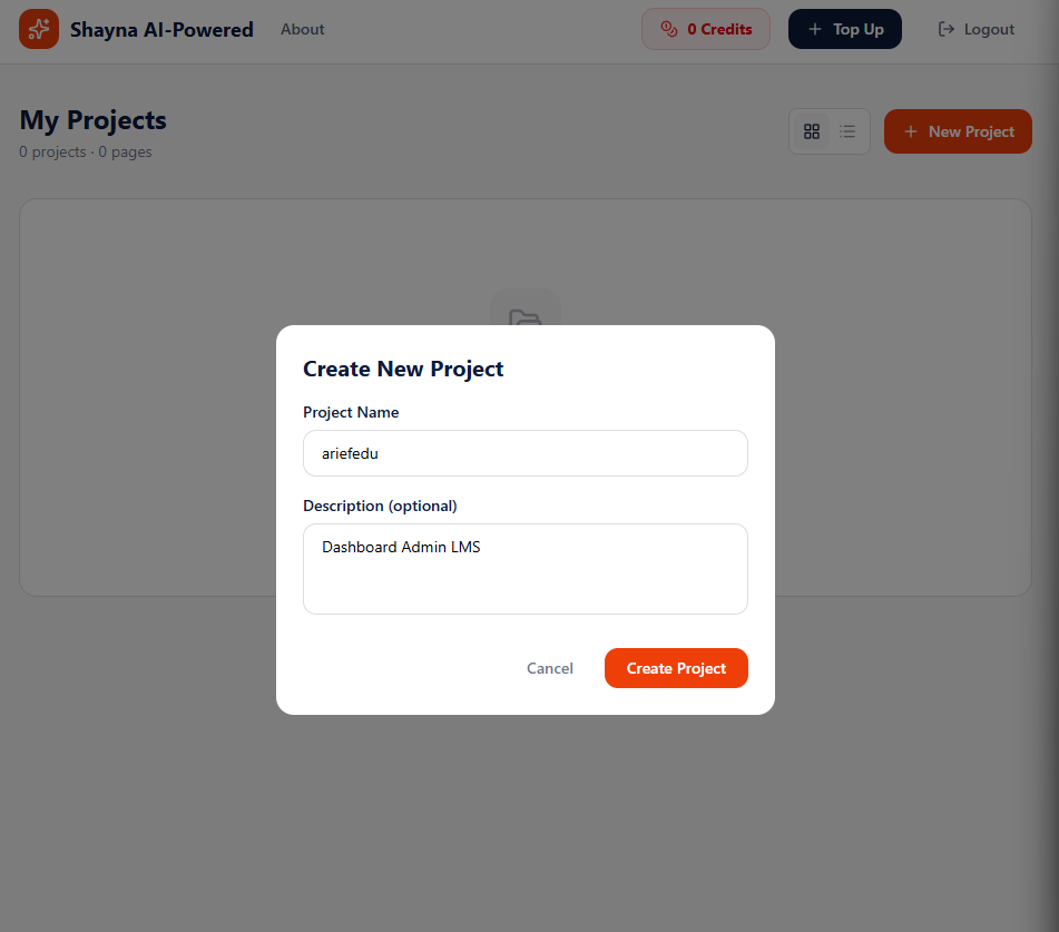 Isikan nama project dan deskripsinya, kali ini akan membuat dashboard admin kursus online (LMS). Jika sudah tekan tombol “Create Project”