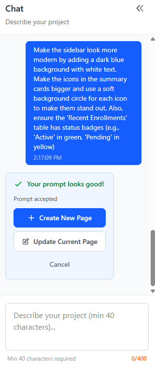 Kalian akan dibawa ke prompt chat untuk generate dashboard.