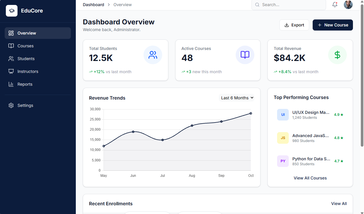 "Make the sidebar look more modern by adding a dark blue background with white text. Make the icons in the summary cards bigger and use a soft background circle for each icon to make them stand out. Also, ensure the 'Recent Enrollments' table has status badges (e.g., 'Active' in green, 'Pending' in yellow)."