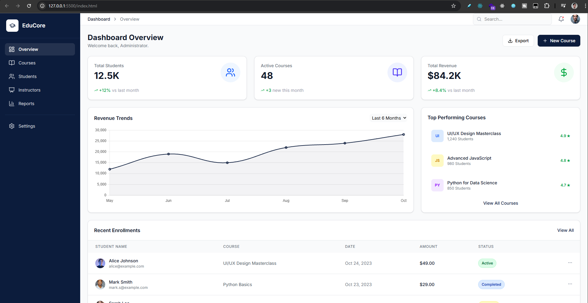 "Create a modern LMS admin dashboard for online courses. It must have a sidebar navigation on the left. The main content should show summary cards for Total Students, Active Courses, and Revenue. Below that, create a data table listing recent student enrollments with status badges. The vibe should be clean, professional, using blue and white as primary colors."