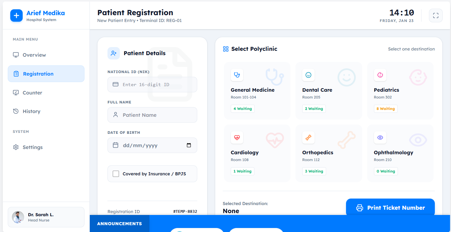 - Prompt Refinement: Change main content to 'Patient Registration'. Left: Form (NIK, Name, DoB). Right: Polyclinic selection grid. Bottom Right: Large 'Print Ticket' button. Keep sidebar/header. Set 'Registration' menu as active.