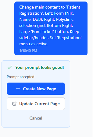Sekarang kita gunakan strategi hemat kredit. Jangan buat proyek baru! Gunakan fitur chat di halaman yang sama untuk mengubah area tengah (Main Content) menjadi halaman-halaman operasional lainnya.