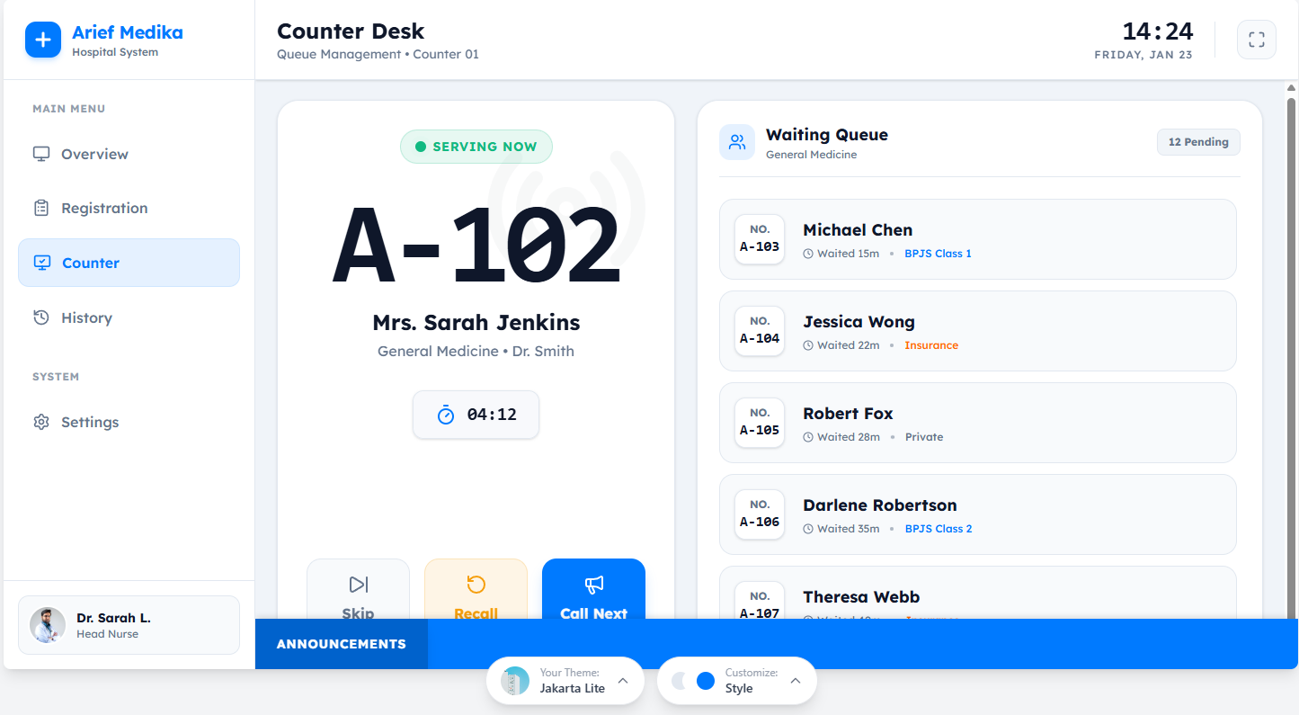 Hospital Queue Monitor. Sidebar: Overview, Registration, Counter, History, Settings. Header: Logo, Clock. Main Content: 3 Large Cards showing Current Queue (General, Dental, Pharmacy). Below: Grid of waiting lists for each polyclinic. Bottom: Scrolling ticker for announcements. Vibe: High visibility, Jakarta Lite theme, medical blue accent, clean white bg.