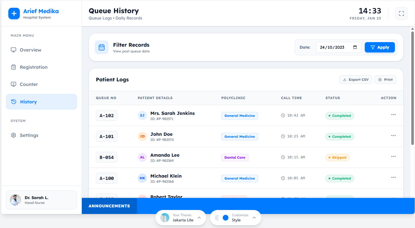 - Halaman Riwayat Antrian (Queue Logs)