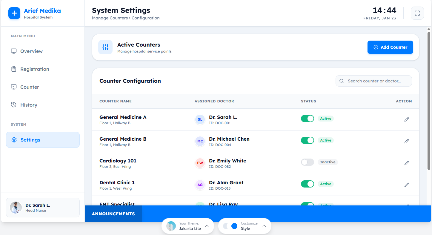 - Prompt Refinement: Change main content to 'Settings'. List of 'Active Counters'. Each row: Name, Doctor, Status Toggle, Edit button. Add 'Add Counter' button on top. Keep sidebar/header. Set 'Settings' menu as active.