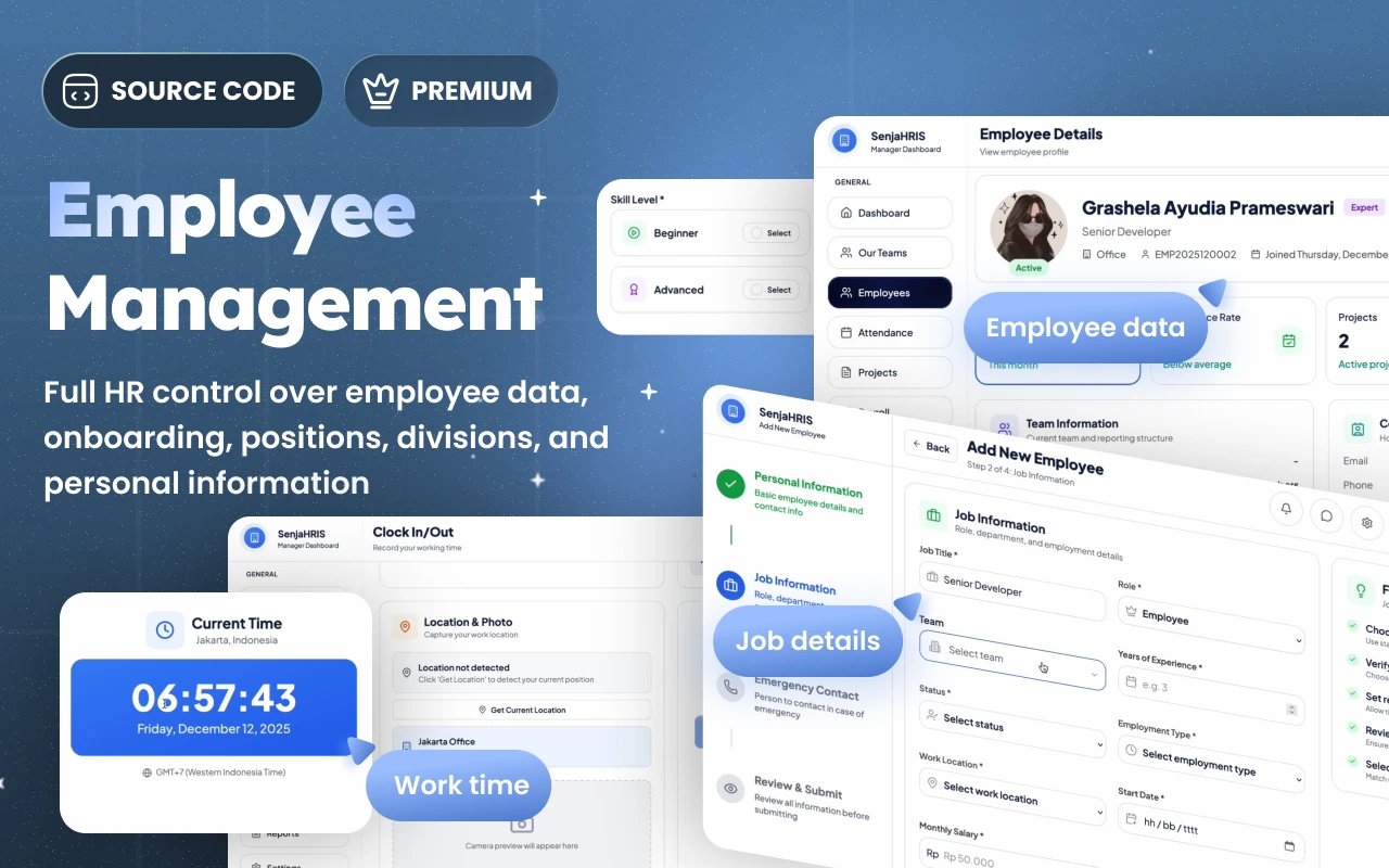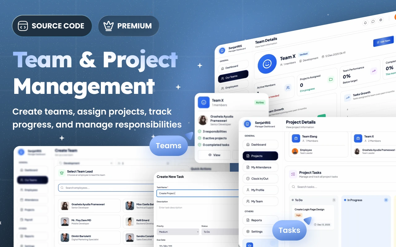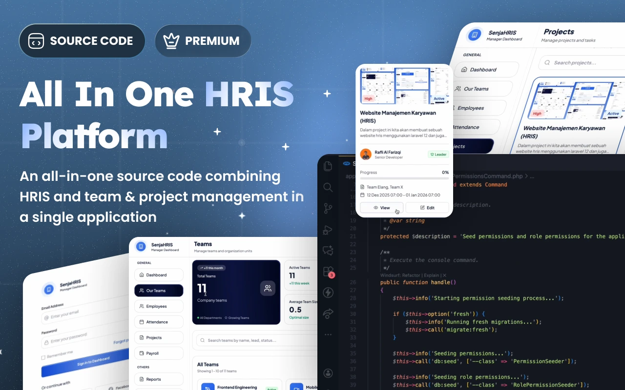 Source code ini adalah paket all-in-one yang menggabungkan sistem Human Resource Information System (HRIS) dan Manajemen Proyek & Tim dalam satu proyek siap pakai.