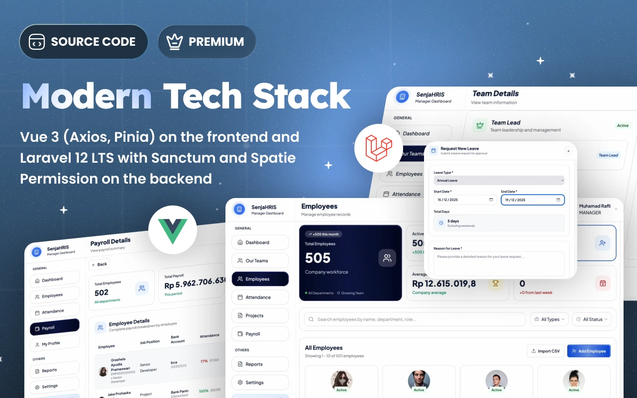 Frontend memakai Vue 3 dengan Axios dan Pinia untuk state management, sedangkan backend dibangun menggunakan Laravel 12 LTS dengan Sanctum (auth) serta Spatie Permission (RBAC). Hasilnya: satu aplikasi terpadu untuk mengelola data karyawan, absensi, cuti, penggajian, dan tim langsung bisa dipelajari, dikustom, atau dijual ke perusahaan yang butuh solusi HR digital modern.