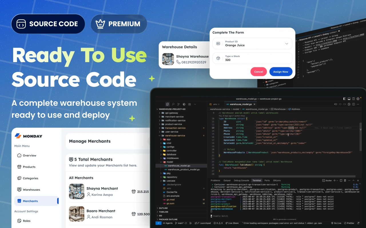 Tinggalkan proyek yang setengah jadi, mulai dengan aset yang siap digunakan dan fokus pada pengembangan bisnis atau klien Anda. Daftar sekarang dan mulai bangun sistem warehouse Anda dengan Golang & ReactJS.