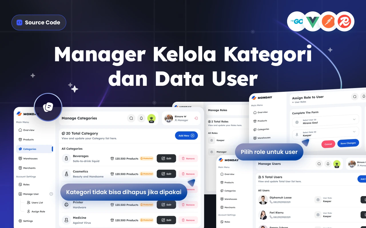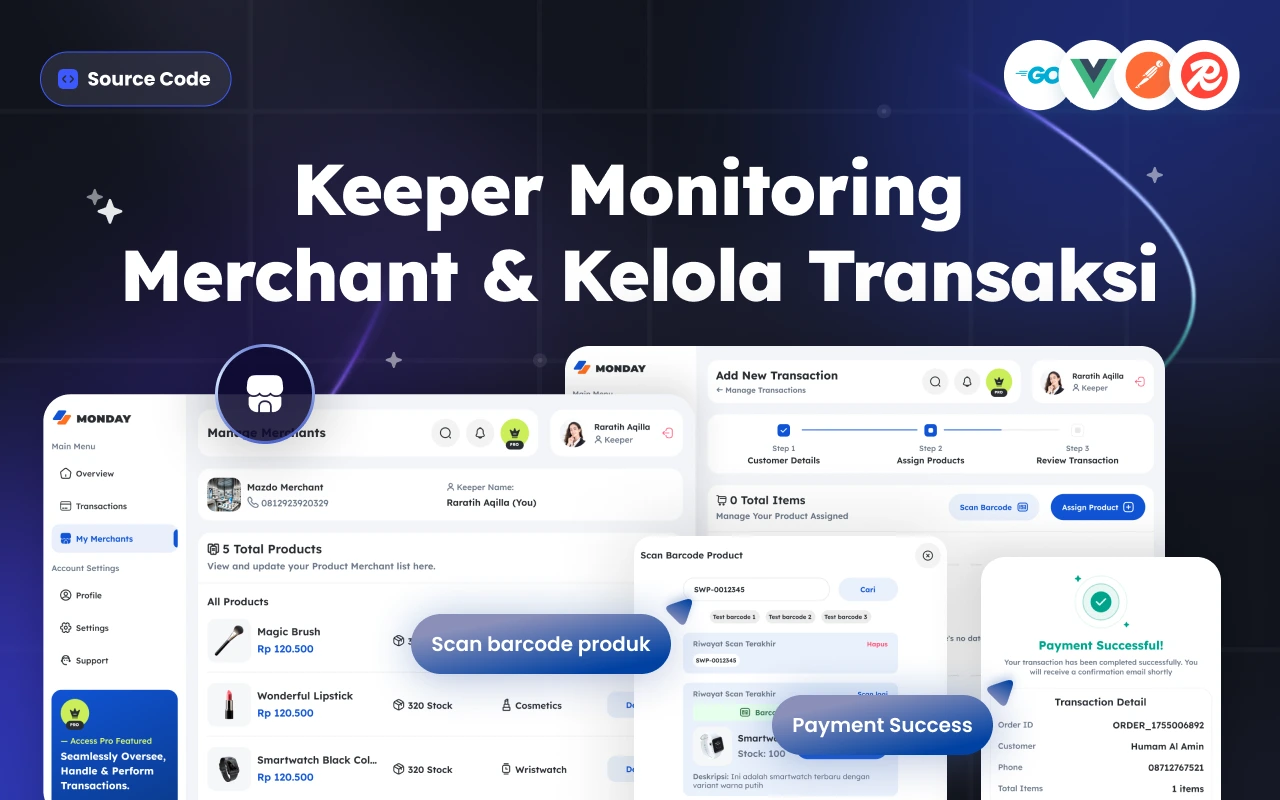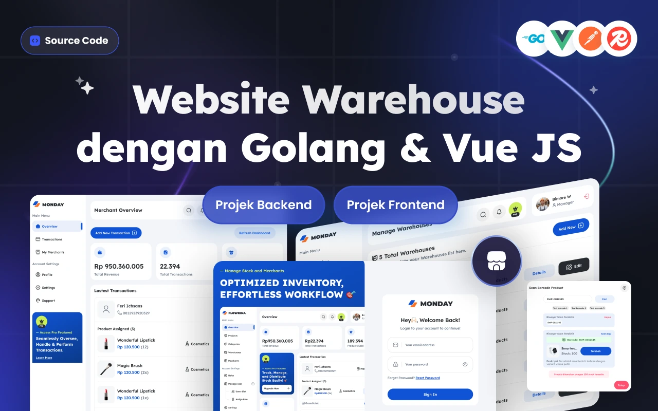 Source code ini adalah paket all-in-one yang menggabungkan sistem Warehouse & Point of Sales berbasis microservices dengan frontend Vue.js dalam satu proyek siap pakai.